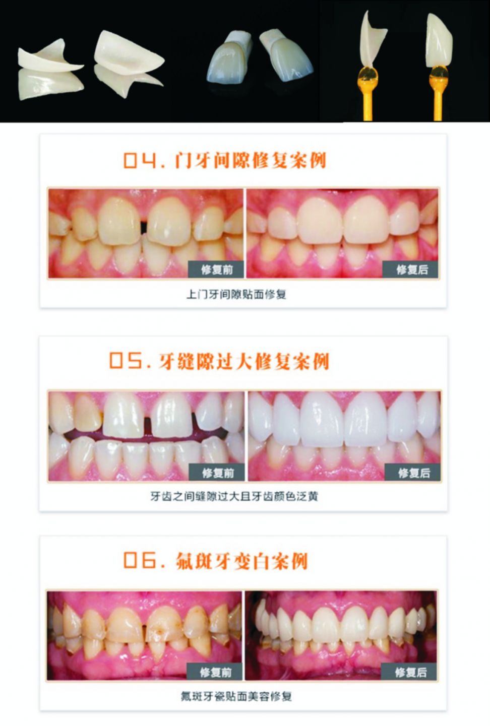 超薄不備牙, 微創(chuàng)便捷, 只需就診兩次,輕松擁有靚牙; 超薄貼面僅0.2mm,安裝后舒適自然,無異味感 適用于四環(huán)素牙,氟斑牙,牙釉質(zhì)發(fā)育不全,牙齒間 隙過大、前牙冠折、牙齒過小等: